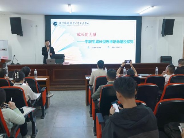 温州华侨职业中等专业学校的黄书河老师做了关于《成长的力量——中职生成长型思维培养路径探究》的经验分享,他把成长型思维融入自己的工作实践中,用“故事”、“重塑语言”“错误日志”“脑科学”等方法来培养学生的成长型思维。