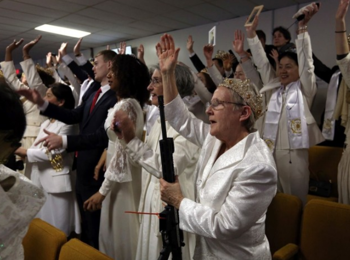 举办集体婚礼,也成为这一邪教最为鲜明的特点之一。德国之声、华盛顿邮报等媒体曾报道,2018年2月28日,“统一教”在美国宾夕法尼亚州东北部波克纳山区举办集体婚礼,约250对信徒夫妇手持AR-15机枪,在其聚会场所发表婚姻誓言,或者再次确认婚姻誓言。该组织声称,他们为未婚夫妇举办的婚礼都要需要携枪参加,这意味着结婚者具有“捍卫”自己的家庭、社区和“上帝的国家”的能力。