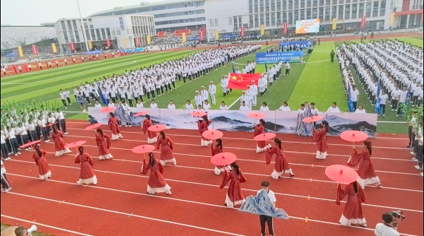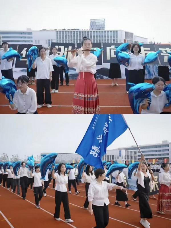 教师方阵压轴登场。“豚宝”是学校的吉祥物,飘扬的海豚气球承载着“创生向未来”的美好期许,卢青老师所吹悠扬的笛声在操场上空传递、绽放,呼应了职专“循大道,惟创生”的育人初心。