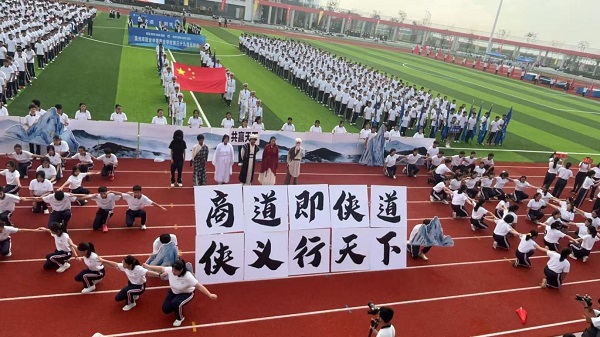 随后学生齐诵:“侠之大者,为国为民。作为新时代的少年,我们要弘扬和继承侠士精神,为中华之崛起,华夏之复兴,赴汤蹈火,在所不辞。”经贸学子的侠商宣言掷地有声。