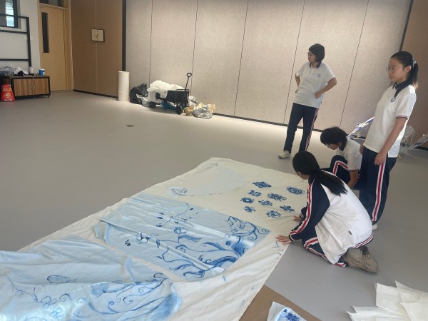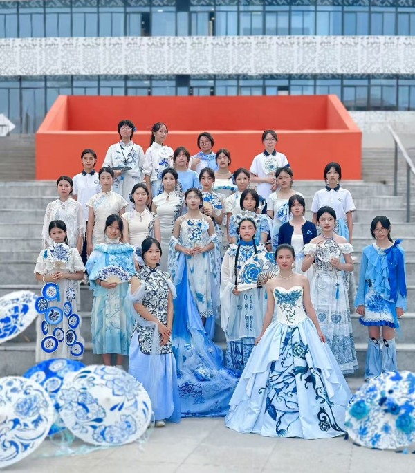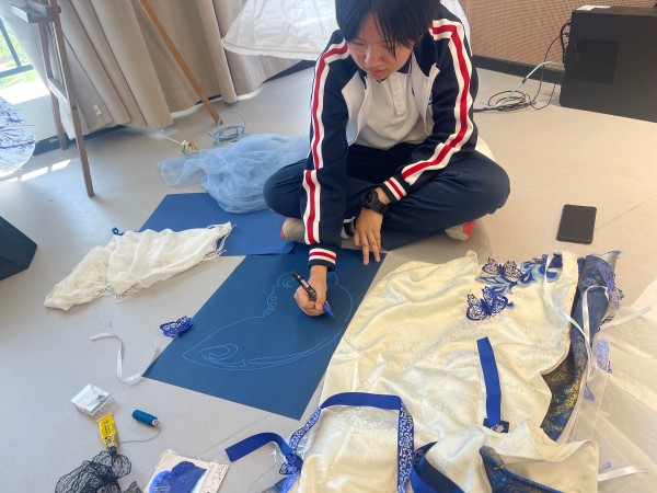 为确保设计理念能完美转化为实物,同学们充分利用了数字化技术。他们将精心设计好的图案通过网络平台进行专业“打版”,将天马行空的创意转化为精准的裁剪纸样。随后,同学们走入线下裁缝工作室,由专业裁缝进行缝制。一针一线,缝入的是对细节的追求;一笔一画,勾勒的是对传统的敬意。最终,一件件融合了古典韵味的自主设计服装,以及一系列点缀着青花元素的道具,在同学们的巧手中诞生。