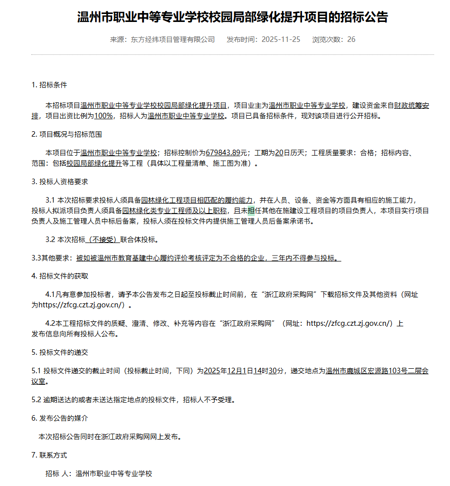 温州市职业中等专业学校校园局部绿化提升项目的招标公告