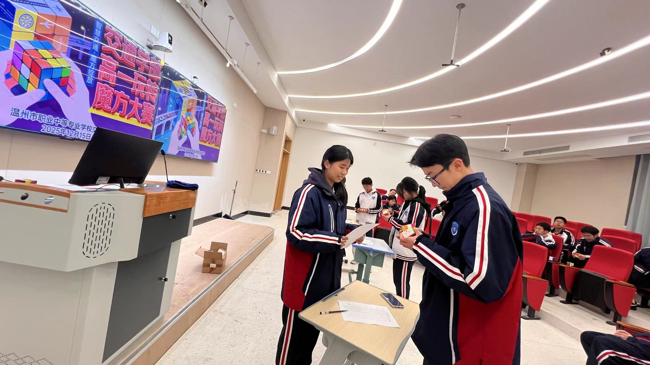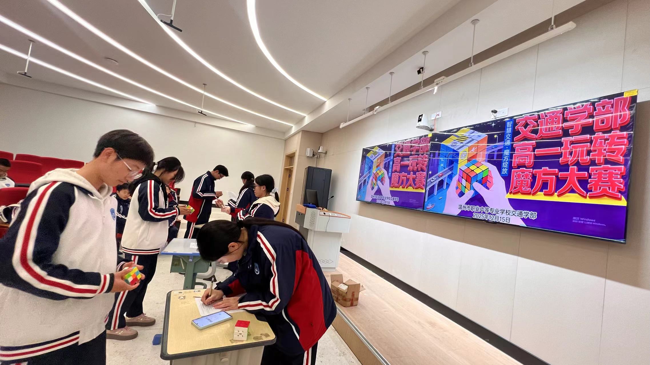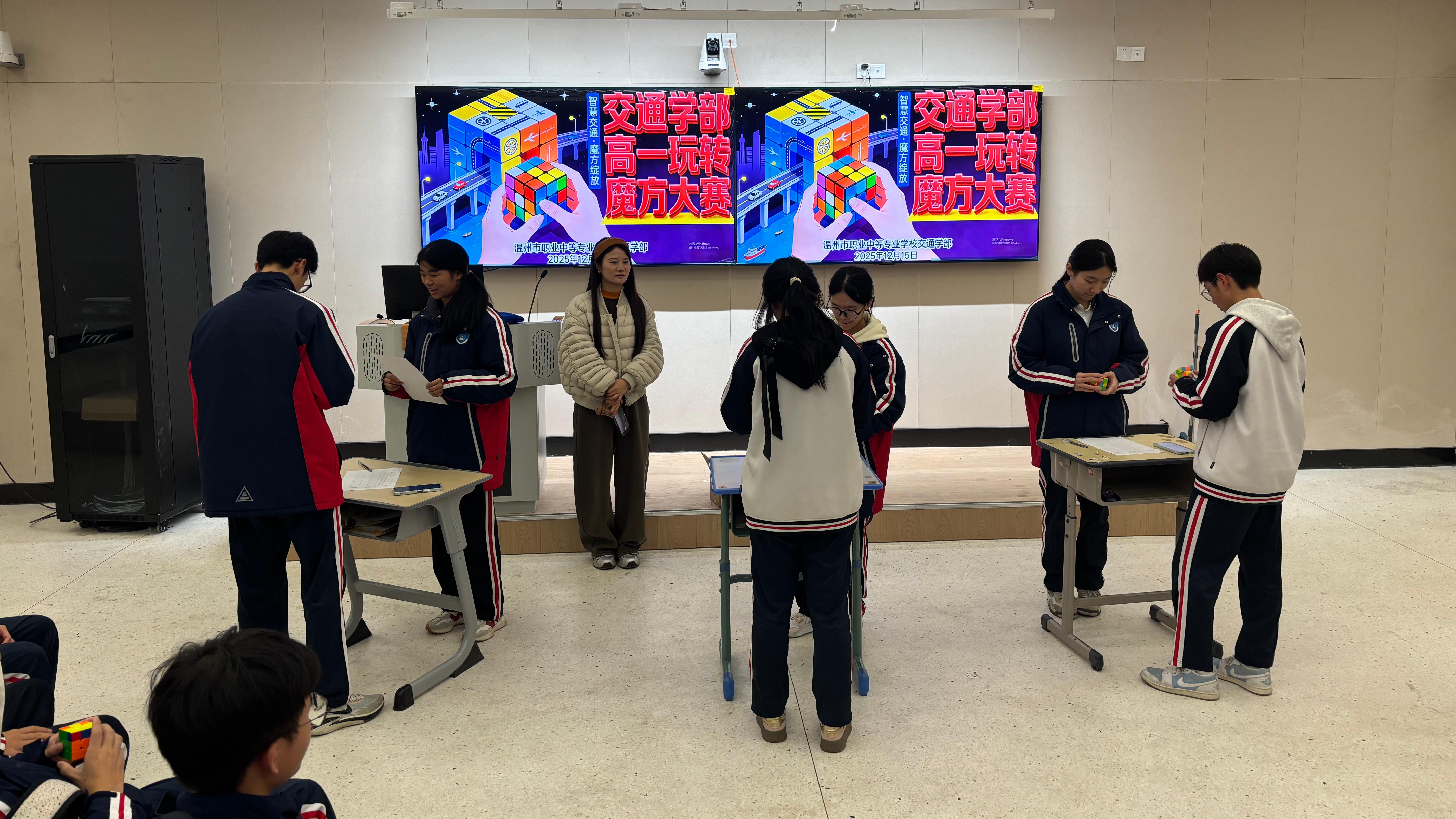 玩转魔方,启迪思维。近日,温职专交通学部数学教研组精心策划的高一玩转魔方大赛在济海楼东 104 教室火热开赛。这场比赛不仅为同学们搭建了展示手脑协同能力的舞台,更让数学学习的趣味性在指尖流转,为课余生活注入了别样活力。
