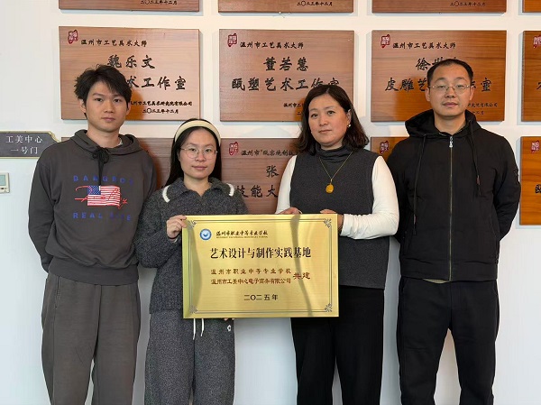 在仪式现场,我校艺体学部张宇主任、邵鹏翔教学主任与温州市工美中心电子商务有限公司的代表共同出席,双方人员一同手持“艺术设计与制作实践基地”牌匾合影留念,标志着合作正式开启。背景墙上挂着的众多“温州市工艺美术大师”牌匾,彰显出此地浓厚的艺术氛围,也为此次合作奠定了良好的文化基调。
