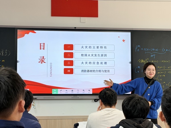 在班会课上,班主任结合近期全国校园消防安全案例,以图文并茂的形式讲解火灾的主要特性——火灾具有蔓延速度快、烟气毒性强、扑救难度大的特点,尤其在宿舍、实验室等人员密集场所,短短几分钟便可能形成“火海”,让学生直观认识到火灾的危害性。针对校园场景,班主任重点剖析火灾发生原因,指出违规使用大功率电器、私拉乱接电线、课间玩火、楼道堆放易燃杂物等是校园火灾的主要诱因,特别强调宿舍内禁止使用违禁电器。