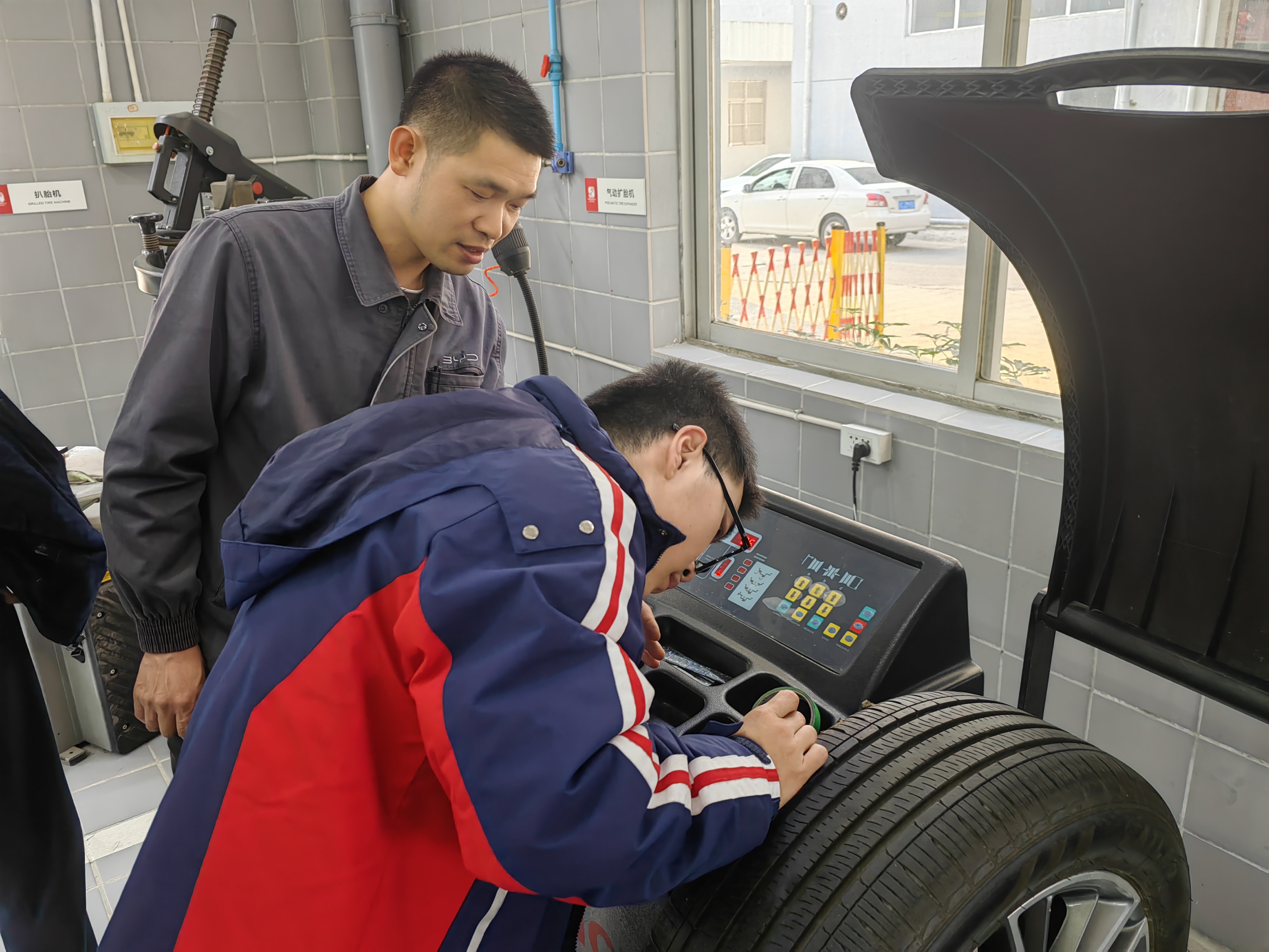 红旭集团选派的资深维修技师化身“产业导师”,围绕两大典型工作任务展开教学。在比亚迪新能源车辆四轮定位和车轮动平衡调试教学中,技师一边娴熟操作专业设备,一边拆解技术原理,讲解参数调试的核心要点;在奥迪车辆常规保养环节,技师示范了机油更换、滤芯检查、胎压监测等标准化流程,强调了岗位规范与细节要求。带队专业教师全程跟班,既辅助技师解答专业疑问,又引导学生做好技能点记录,校方工作人员同步拍摄实践全过程,为后续教学资源包建设留存宝贵素材。下午批次学生也于14点30分准时到岗,完成了同等标准的实践学习。