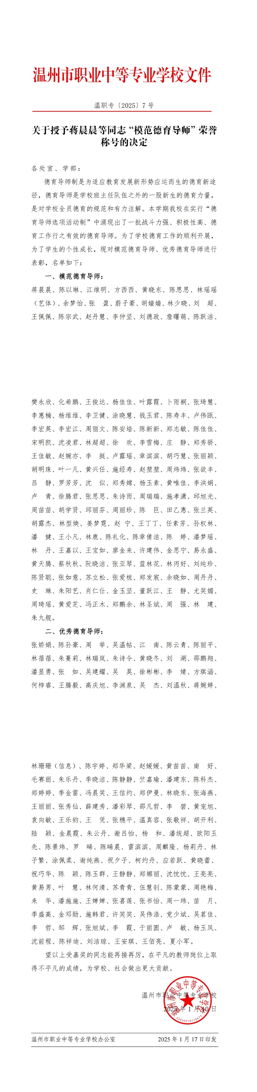 温职专关于授予蒋晨晨等同志“模范德育导师”荣誉称号的决定