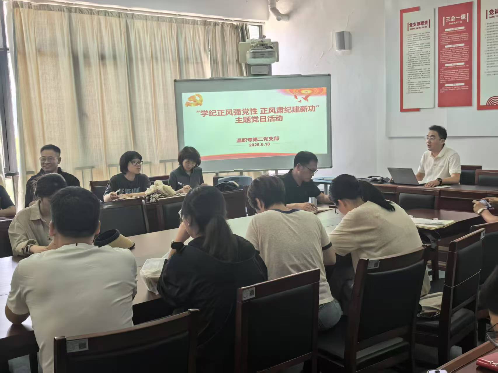 6月18日,第二支部在A201党员会议室成功举办了“学纪正风强党性,正风肃纪建新功”主题党日活动。此次活动由支部书记王佰亮同志主持,全体党员积极参与,共同接受了一次深刻的纪律教育和党性洗礼。