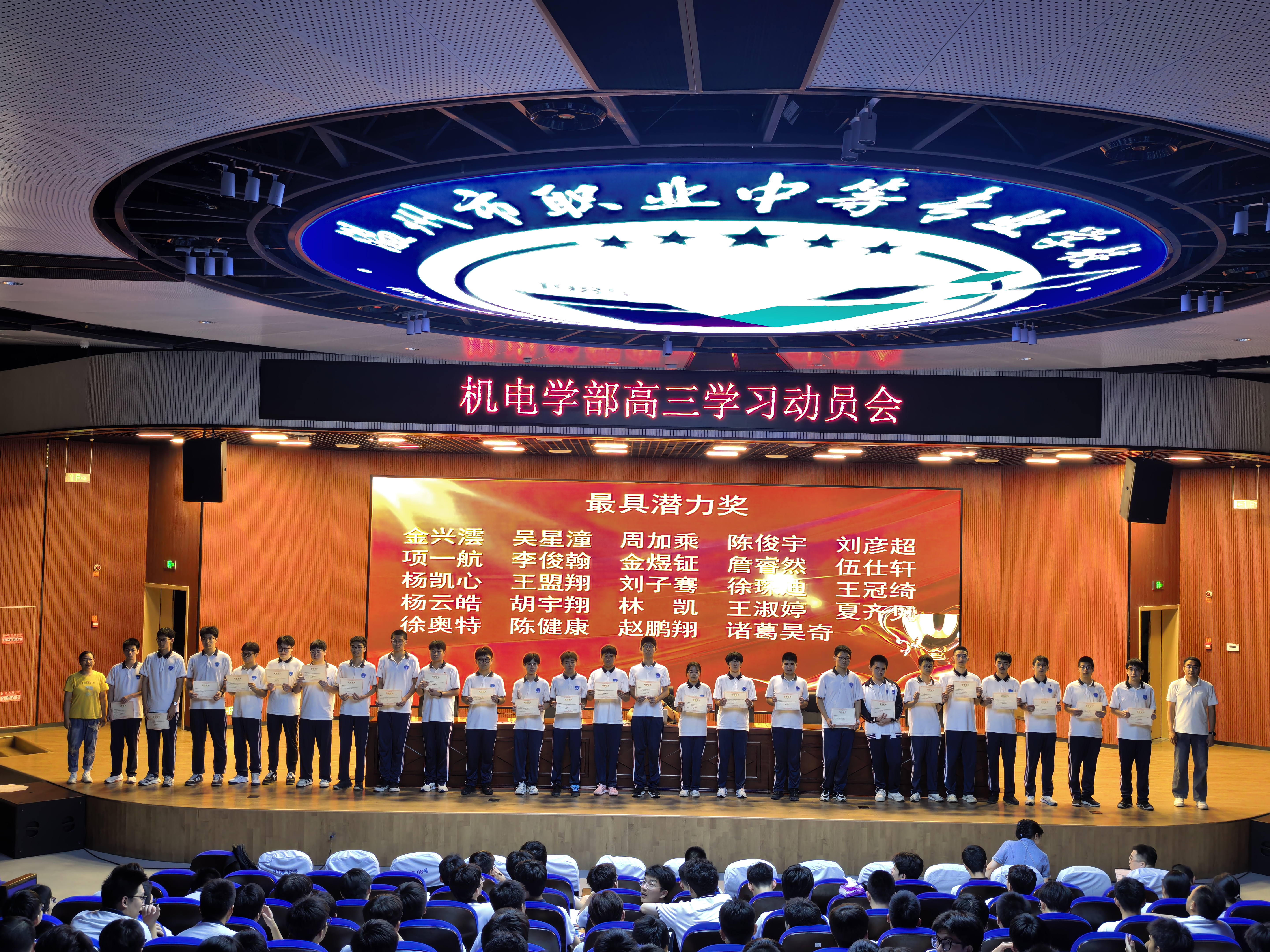 会议伊始,在副主任夏小军的主持下,机电学部对在浙江省联合体第一次调研考试中取得优异成绩和显著进步的同学进行了表彰。共评选出“最具潜力奖”74人、“最佳进步奖”23人,表彰他们在暑期线上辅导及本次调研考试中的出色表现。获奖同学分批上台领奖,现场掌声不断,气氛热烈。此次表彰不仅肯定了同学们的努力,也为全体高三学生树立了学习榜样。