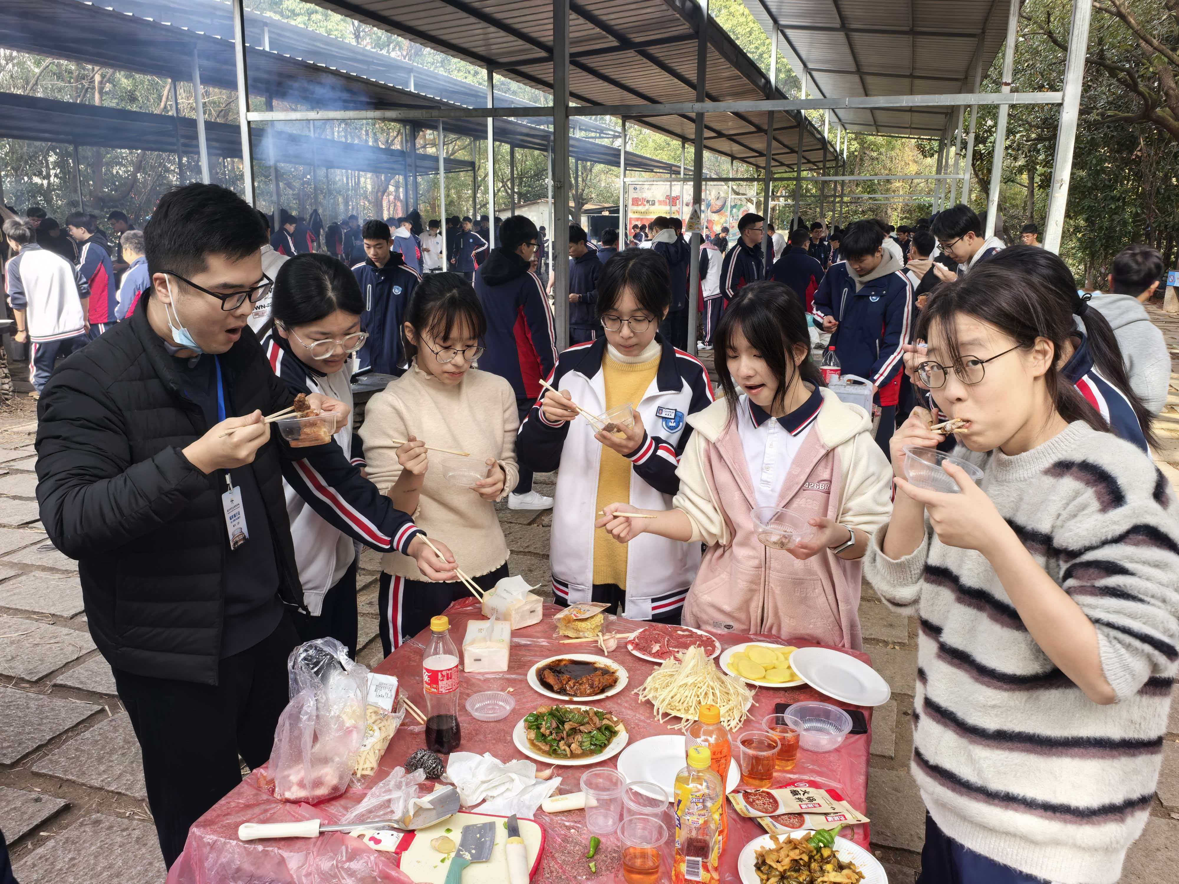 老师们也加入了这场烟火盛宴。不同于课堂上的严谨,老师们拿起锅铲的瞬间,塑造了同学们眼中最鲜活的“反差萌”:翻炒、调味、装盘,熟练的动作让同学们忍不住围在灶台边惊叹“原来老师还有这手艺”。当老师们把刚出锅的美食递到学生手里,一句“尝尝我的手艺”,让师生间的距离在烟火气里悄然拉近。