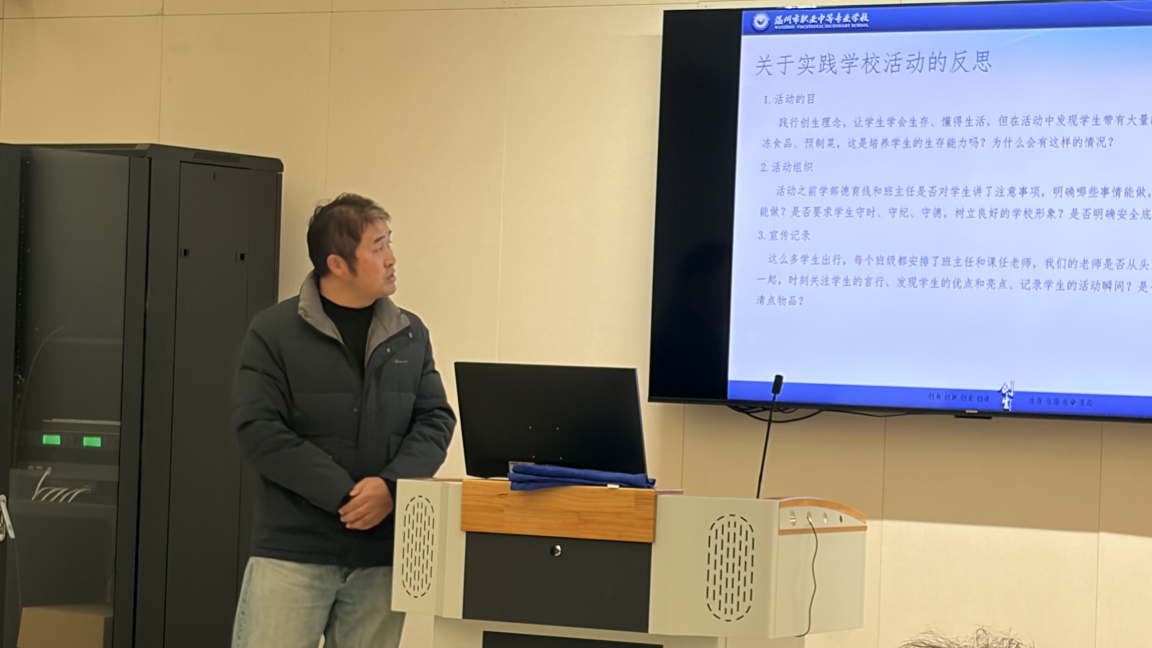 随后,张主任聚焦实践学校活动反思展开深度剖析,从活动目的、活动组织、宣传记录三个维度直击问题本质。他指出,实践活动以践行“创生”理念、培养学生生存与生活能力为核心目标,但活动中发现学生携带方便面、速冻食品、预制菜的现象,与育人初衷存在偏差,需深入剖析背后原因;在活动组织上,要反思学部德育线与班主任是否提前向学生明确活动注意事项、行为准则及安全底线,是否强调守时、守纪、守德的校园形象要求;在宣传记录方面,各班带队教师需自查是否全程跟进学生、关注学生言行、捕捉活动亮点,以及是否落实按时点名、清点物品等管理细节。张晓锋主任强调,全体教师要正视问题、查摆不足,共同探索贴合职业教育特色的实践活动优化路径。