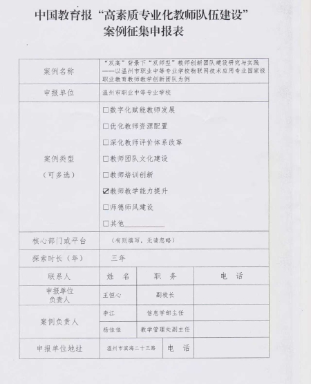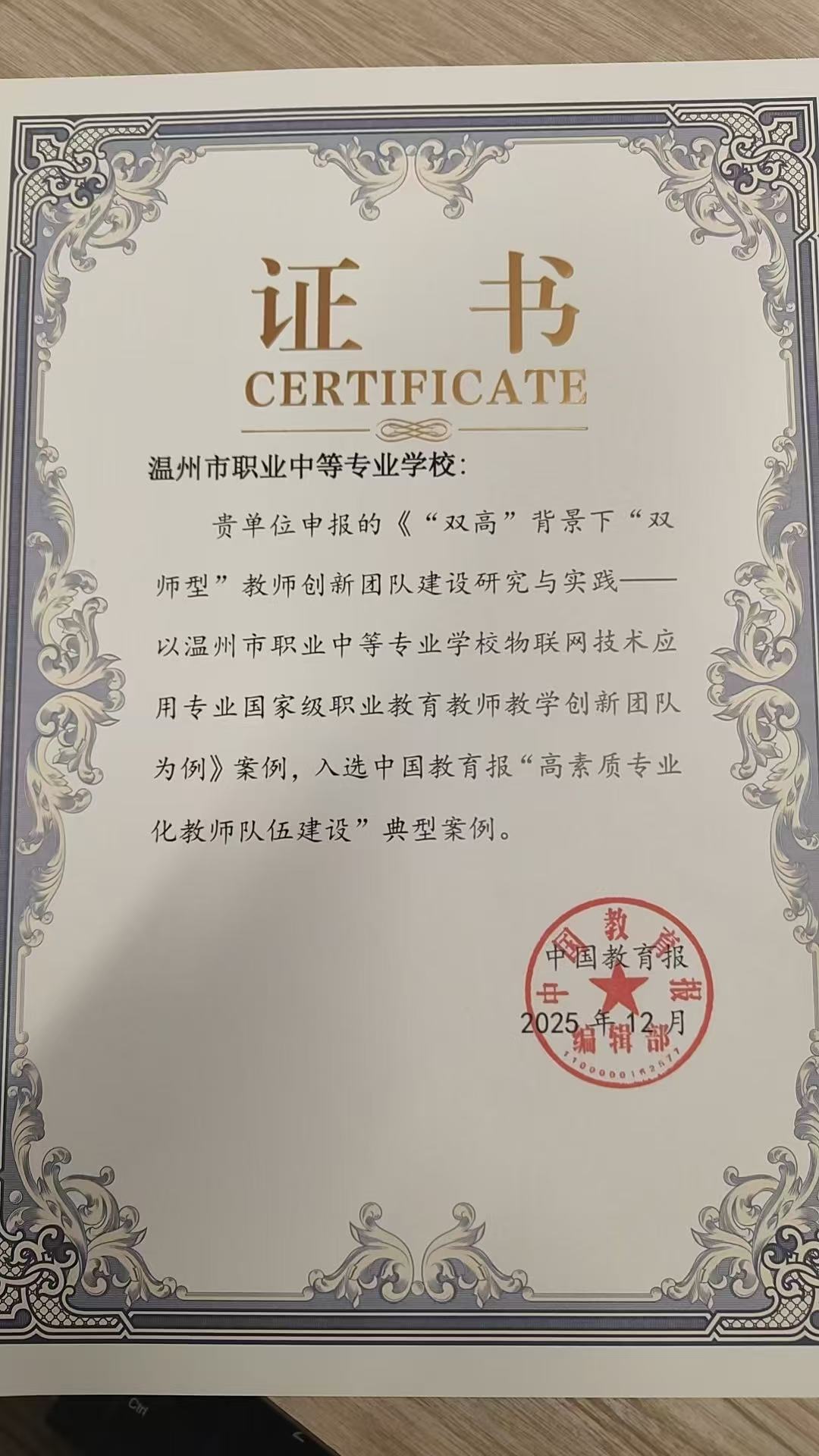 近日,我校再传职教佳音,信息学部申报的《“双高”背景下“双师型”教师创新团队建设研究与实践——以温州市职业中等专业学校物联网技术应用专业国家级职业教育教师教学创新团队为例》案例,成功入选中国教育报“高素质专业化教师队伍建设”典型案例,这是学校在“双师型”教师队伍建设领域的重要成果,更是温州职业教育在师资培育模式创新上的全国性认可。